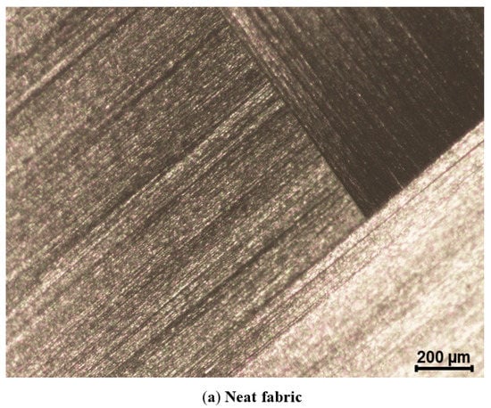 In the LCM process, the permeability along the out-of-plane direction (z-axis) is also important when the resin is first injected into the fiber surface because of the flow media or the gap between the mold and then impregnated in the vertical direction of the surface. Consequently, the permeability in the out-of-plane direction was measured using the equation in Section 2.3.2, and the results are shown in Figure 8 and Table 3 according to the three types of fiber volume fractions: 50%, 55%, and 60%. To investigate the effect of the binder treatment, neat fabric preform and two types of binder-treated fabric preform (without heat treatment and with heat treatment during the preforming process) were prepared. As with the tendency of change in the permeability in the in-plane direction, all three cases showed a tendency to decrease the permeability of the preform in the out-of-plane direction when the fiber volume fraction increased. In addition, the binder-treated preforms exhibited a lower permeability than that of the neat fabric preforms. When the fiber volume fraction was 50%, 55%, and 60%, the permeability of the binder-treated preform without heat treatment exhibited a 78–79% reduction, and the binder-treated preform with heat treatment exhibited a 97–98% reduction compared to the permeability of the neat fabric preform. These results indicate that the binder treatment hindered the impregnation of resin in the out-of-plane direction. In particular, the permeability of the binder-treated fabric preform with heat treatment during the preforming process decreased more than that of the binder-treated fabric preform without heat treatment because the binder was softened during the heat treatment and permeated between the fibers under the 1 atm pressure applied by a vacuum bag. This phenomenon can greatly affect the reduction in the permeability of the fiber preform. To support this argument, micro observations of the binder in the preform is discussed in Section 3.3 below.