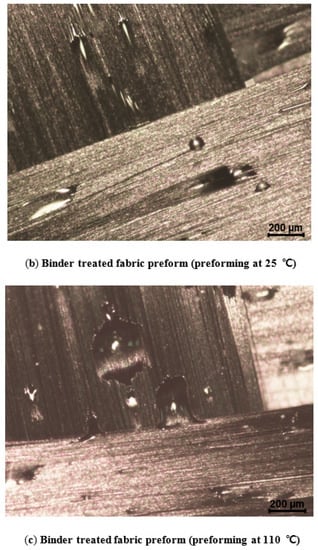 To observe the shape of the binder in the preform, an ECLIPSE LV 150N optical microscope was used. Unlike the smooth surface of the neat fabric preform (Figure 9a), the original size of the powder binders lightly attached to the fiber surface was observed on the binder-treated preform without heat treatment during the preforming process (Figure 9b). In contrast, the preform that underwent heat treatment during the preforming process exhibited binders pressed in the in-plane direction and that adhered to the fiber in a flat shape (Figure 9c). The binder processed with a temperature above the glass transition temperature was flattened while being applied by a vacuum bag of 1 atm, and some of these binders permeated between the fibers and had a flat shape in the fiber in-plane direction to reduce the out-of-plane directional space where the fluid can flow. In the two types of binder-treated fabric preform (Figure 9b,c), the impregnation of the test fluid was disturbed by the binder occupying space to pass, resulting in a decrease in the permeability of the preform, especially in the heat-treated preform (Figure 9c), where the binders having a flat shape in the fiber in-plane direction led to a significant decrease (>97%) in the out-of-plane directional permeability.