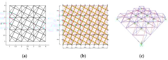 An analysis of plates composed of Simplex modules was carried out, among others, by Kono and Kunieda [], Gomez-Jauregui et al. [] and Olejnikova []. Kono and Kunieda created the first experimental model of the tensegrity plate. It was built with thirty-three modified Simplex modules. The span of the structure was 9 m, and its area was 80 m2. Skelton and Oliveira compared the properties of tensegrity structures created from the same modules, but connected in different ways. The Gomez-Jauregui team proposed a method of obtaining tensegrity panels based on the geometry of traditional double-layer trusses, while Olejnikova studied constructions with single and double curvatures.