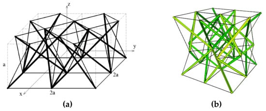 Apart from standard applications of tensegrity plates, non-standard ones can be found. Interesting proposals of using double-layered tensegrity grids were presented by Al Sabouni-Zawadzka and Gilewski [,,] (Figure 3). In the paper [], the researchers presented the concept of modeling tensegrity plates as a continuous model. This approach was also used by Obara [,]. Al Sabouni-Zawadzka and Gilewski additionally proposed the use of tensegrity plate-like structures built with Simplex and Quartex modules as intelligent constructions [] and structures of metamaterials []. As in the works of Al Sabouni-Zawadzka and Gilewski, the use of tensegrity in the context of intelligent construction was dealt with by Fest, Shea and Smith [,]. They proposed the concept of a plate built with three or five adjustable tensegrity star modules.
