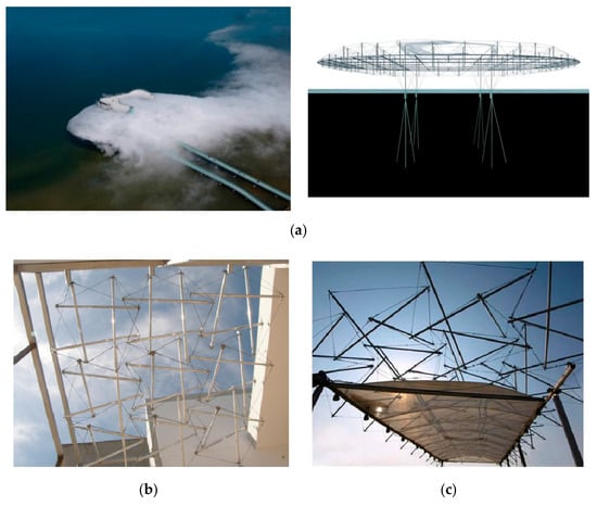 Practical applications of tensegrity in civil engineering: (a) Blur Building [], (b) a patio roof of a bank annex (Athens, Greece) [], (c) an exhibition pavilion for Patras Cultural Capital of Europe (Patras, Greece) [].