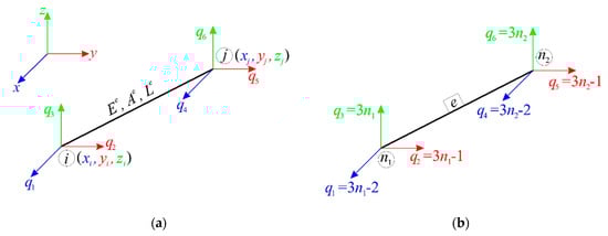 The space truss finite element of Young’s modulus , cross-sectional area  and length  (Figure 5a) are used to model the components of the tensegrity structure. In a global coordinate system  a finite element is described by the compatibility matrix :