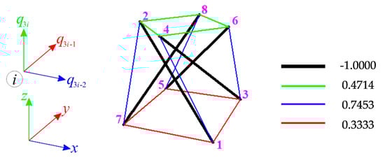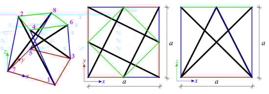 The first considered structure is the single modified Quartex module (Figure 6). The module consists of sixteen elements (n = 16), i.e., four struts and twelve cables, and eight nodes (w = 8). Its shape is based on a regular prism. The projection of the top surface of the modified Quartex module is inscribed into the bottom one, allowing for the easy connection of single units into multi-module structures [,,,,,]. The considered module’s dimensions allow it to fit into a unit cube. The coordinates of the nodes and the numbers of elements are shown, respectively, in Table 2 and Table 3.