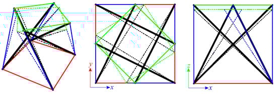 A lot of papers about tensegrity plates are authored by Wang [,,]. Wang proposed many tensegrity plate-like structures composed of Quartex modules connected together in various ways. Wang used other tensegrity modules to build plates as well. He presented numerous interesting examples of tensegrity plate-like structures built from regular or modified octahedron modules. Wang also proposed a temporary tensegrity plate-like structure, which could be folded and unfolded if necessary.