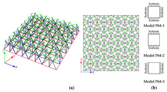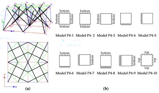 Four-module tensegrity plate-like structure: (a) geometry, (b) models—bottom means that lower nodes 1–4 and 6–9 are supported; top means that upper nodes 10–12, 14–16 and 18–21 are supported.