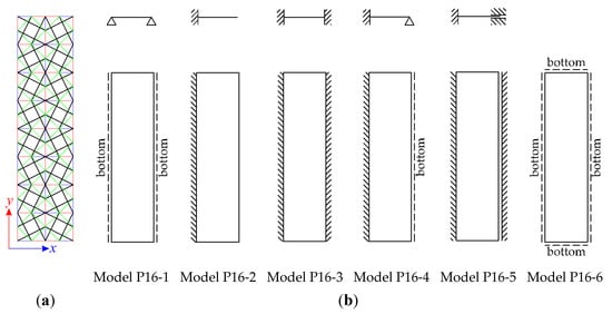 The structure built with four modified Quartex modules is considered (Figure 9a). The plate consists of 56 elements (n = 56) and 21 nodes (w = 21). Ten models with different methods of support, shown in Figure 9b, are considered: