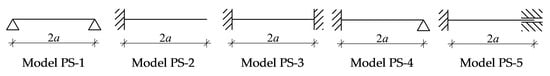 All models feature self-stress states (S) but only for model PS-1 does a mechanism (M) exist. Only the superposed self-stress state identifies elements properly. The tangential stiffness matrix  for model PS-1 has all positive eigenvalues. It means that the mechanism is infinitesimal and the structure is stable. All considered models satisfy the requirements of the characteristics T and C (structures are trusses and tensile elements are cables with zero rigidity in compression). Due to the occurrence of the mechanism, model PS-1 satisfies the conditions of structures with tensegrity features of class 1. The rest of the considered models, i.e., models PS-2–PS-5, are classified as having only tensegrity features of class 2 because of the lack of mechanisms. Comparing the analyses performed for the sixteen-module plate and plate strip, it can be noticed that the number of mechanisms obtained from the corresponding models (i.e., P16-1 and PS-1, P16-2 and PS-2, etc.) is equal.