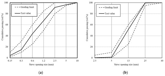 Gradation sieve analysis test result for the aggregates: (a) Fine aggregates and (b) coarse aggregates.