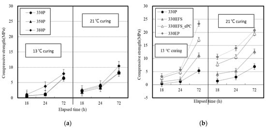 For 330HFS, the concrete strength was slightly higher compared to OPC until 24 h. However, it significantly increased and exceeded 10 MPa at 72 h under the curing condition at 13 °C. For 330HFS_EPC, the compressive strength was 2.7 MPa at 18 h and close to 5 MPa at 24 h. It increased with a slope similar to that of 330HFS at 72 h, thereby exhibiting very high strength development compared to 330P. 330EP exhibited a difference in strength development of less than 1 MPa compared to 330HFS_ePC, but showed a significantly higher compressive strength increase rate at 72 h.