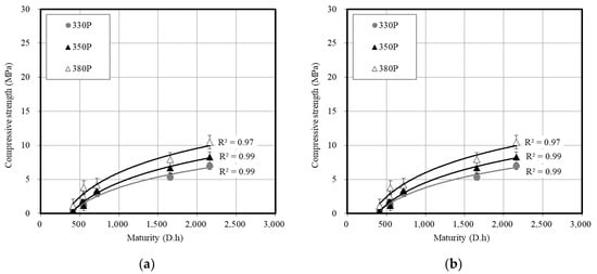 Figure 4 shows the relation between the maturity and concrete strength at early ages. For the specimens that used OPC in which the unit weight of cement was increased, the compressive strength development tended to increase according to the maturity, but its effect was not significant. The maturity to develop 5 MPa was 1375 D∙h(330P), 1108 D∙h(350P), and 827 D∙h(380P). For 380P in which the unit weight of cement was increased, the maturity value to develop 5 MPa was approximately 60% that of 330P.