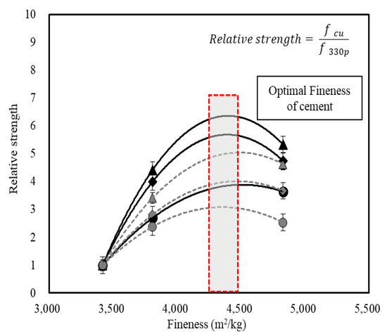 Figure 6 shows the relation of fineness of cement and concrete strength. The relative strength of concrete was calculated as follows:
