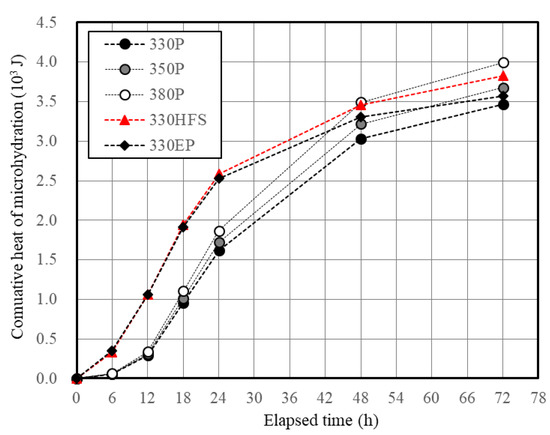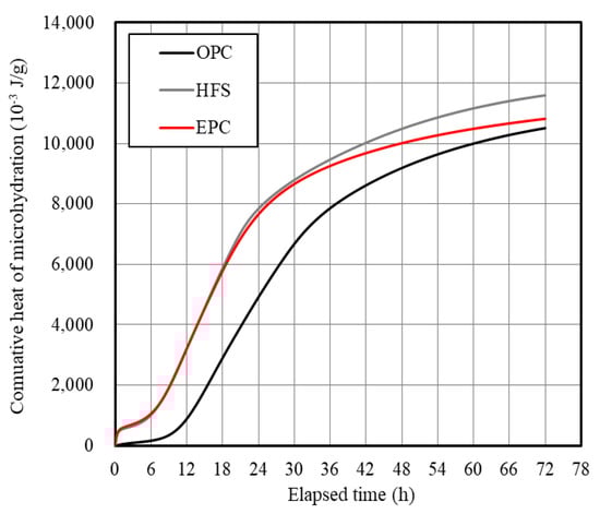 This difference in fineness is significantly related to the hydration reaction of cement. Figure 7 shows the variation in heat of microhydration with elapsed time for each cement type. HFS and EPC had higher microhydration heat values than OPC at early ages less than 24 h. Figure 8 shows the cumulative heat of microhydration for each cement type. The plot of the cumulative microhydration heat of cement also shows that HFS and EPC exhibited values more than twice higher than those of OPC from the point of contact with water. Based on this, the total amount of heat of each mixture can be calculated according to the unit weight of cement.