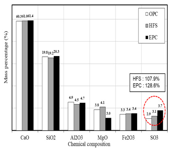 Figure 10 shows the XRF analysis results of OPC, HFS, and EPC cements. The SO3 contents of HFS and EPC were observed to be higher than 3%. They were approximately 107–129% higher than value of OPC. The SO3/Al2O3 value that represents the early strength performance of concrete was 116.1% higher for HFS and 132.2% higher for EPC than that of OPC.