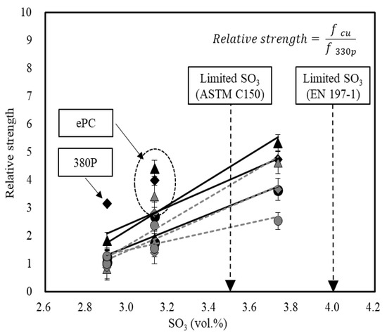 Mohammed and Safiullah [35] and Lee and Lee [14,15] reported that the compressive strength significantly increased after 48 h when the SO3 content was between 3.0% and 3.2%. They also mentioned that increasing the fineness of cement (for which the SO3 content was increased to 3.1% here) had a large impact on the early strength. In this study, when EPC was additionally used in the SO3 content range of less than 4%, a strength development similar to the level of concrete using EPC was achievable.