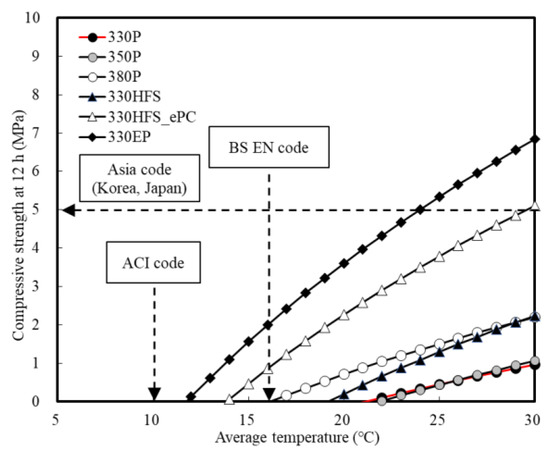 Figure 12 shows the variation in concrete strength according to the average temperature after 12 h. Based on the relationship between the maturity and concrete strength, concrete strength development after 12 h of curing time was calculated and reviewed by referring to the codes of each country [36]. This was conducted to derive the optimal mixture by establishing an objective criterion for the formwork removal time of concrete.