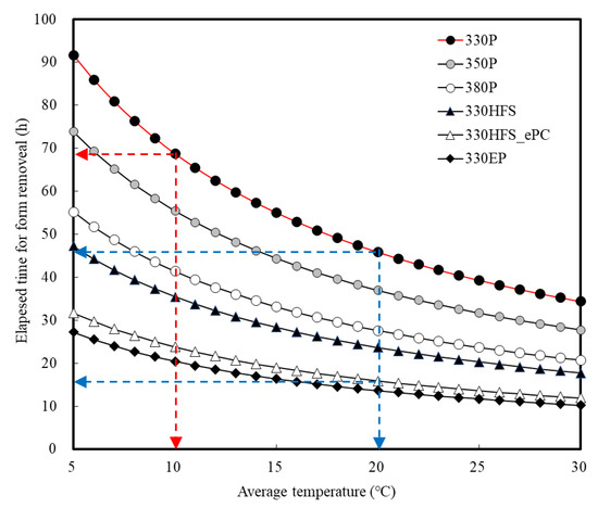 - The criterion of each country for the formwork removal time on concrete were examined and applying the Asian criterion was judged to be effective, which presents a clear compressive strength of 5 MPa. The use of EPC and HFS_ePC can shorten the formwork removal time by 20–24 h at 10 °C and by 14–16 h at 20 °C.