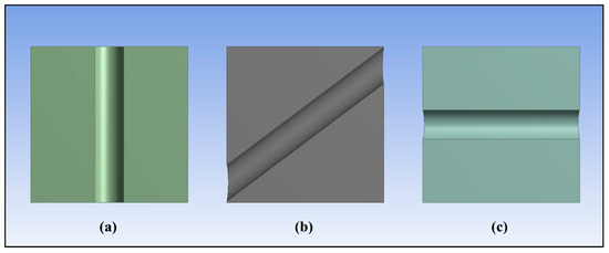 Since the samples are being subjected to compressive loads, shear failure is expected to dominate in this loading condition and thus, the maximum shear stress plots are presented to identify the high-stress regions and elucidate their three-dimensional distribution around the drilled holes, which are areas of stress concentration. However, stress development in a component is never uniform with different parts of the component experiencing different levels of plastic deformation. Simulation software can provide how much the volume of the solid experiences a particular level of plastic deformation/strain. Since the specimen is subjected to variable loads during experiments and a constant load during simulation, to make suitable comparisons between simulations and experiments, after every simulation, the plastic zone volumes at a particular load-interval (1500 N) were rendered in the cylinder. However, to make a suitable comparison between drill orientations using only simulations, the plastic deformation was compared at a load of 9000 N as this was midway through the plastic deformation (between 3000 N or ~60 MPa, the CYS of monolithic magnesium and 15,000 N or ~300 MPa, the maximum load applied, as shown in Figure 3), thereby accounting for both elastic as well as plastic deformations in all three orientations. At 9000 N, in monolithic 8 mm diameter cylinders, the engineering stress can be calculated to be approximately 180 MPa. This corresponds to a true strain of ~9% in monolithic magnesium. Hence, the plastic zone volume above 9% strain was identified for each case first. While comparing the results, if for a particular case, the plastic zone volume obtained through this method was found to be lesser than another case, then it was deemed that the latter case would fail faster as a larger region reaches failure strains faster without allowance for stress redistribution. This allows us to rank the drill hole orientations on the compressive response of the component.