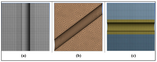 Similar to previous experiments conducted by Matli et al. [36], 8 mm diameter cylinders with 8 mm height were considered in these simulations as well. This resulted in a hole length of 8 mm each on the vertical drill and horizontal drill cases (Figure 1a,c) while it resulted in 9.94 mm in the angular drill scenario (Figure 1b). These lengths were measured along the axis of the drill hole. The above models were built in ANSYS DesignModeler, following which, they were meshed using structural hexahedral and tetrahedral elements in ANSYS Mechanical v19. The vertical, angular, and horizontal drill hole models had 50,200, 245,292, and 77,922 elements, respectively, with a minimum element size of 0.1 mm around the hole. A visual representation of the mesh around the hole is shown in Figure 2.