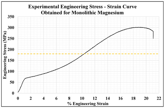 The material behaviour was set to be deformable in elastic and plastic regions with a Young’s Modulus of 45 GPa, a Poisson’s ratio of 0.28 (as reported by Parande et al. [37]), and a true stress–true strain curve for plastic behaviour obtained from monolithic magnesium experiments (i.e., with no drill hole). The engineering stress–strain curve for monolithic magnesium, from which true stress–true strain curve was derived, is represented in Figure 3.