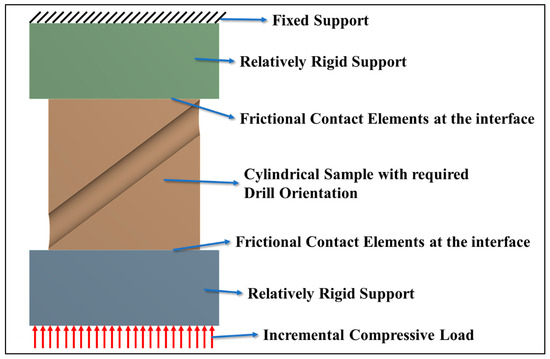 Illustration of the loading and boundary conditions used during simulations of different drill hole orientations.
