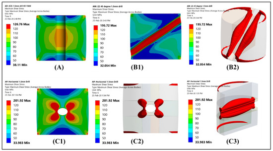 Maximum shear stress plots at 9000 N for (A) vertical drill hole orientation, (B1,B2) angular drill hole orientation and (C1,C2,C3) horizontal drill hole orientation.