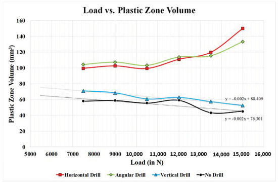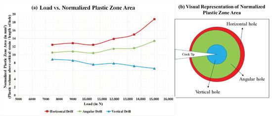 A clear distinction can now be inferred on the load-bearing capacities of three drill hole orientations. From simulations, the first inference is that, at various loads, the vertical drill hole orientation provides better structural stability in compression when compared to angular and horizontal drill hole orientations, as it observes lower plastic zone volume above critical strain (Figure 6) as well as a smaller normalized plastic zone area over critical strain (Figure 7a). Figure 7b further illustrates this inference by showing how different the normalized plastic zone areas around the drill hole are at a 15,000 N compressive load. It is understood that the presence of larger plastic zone volumes above critical strain implies faster crack initiation/propagation around the drill hole leading to premature failure.