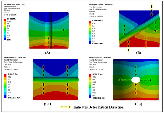 In addition to the shear stress development, as Matli et al. [36] pointed out, the deformation of the hole can provide valuable information on which drill hole orientation is ideal. They also provide valuable information on whether sensors placed in these drill holes could observe any disruption to their regular function. Deformation patterns of the vertical hole orientation, shown in Figure 8A, illustrate similar behaviour to that of Matli et al. [36]. However, as the drill orientation changes to an angular orientation, though the entire sample undergoes compression, the deformation patterns are slightly different for the top half and bottom half of the hole. On the bottom left and top right corners of the component in Figure 8B, the stiffness of the component is comparatively lower due to the presence of the hole, resulting in higher deformations locally (as indicated by the arrows). This can generate an “S” shaped deformation pattern in the hole which may allow more energy absorption during compression. Finally, when the drill orientation is horizontal, the entire length of the drill hole sees a slightly uniform deformation pattern, as shown in Figure 8C1,2, demonstrating the deformation of the cross-section of the hole. A clearer picture of the tension and compression region mentioned in Section 3.1.1 is also visible in Figure 8C2.