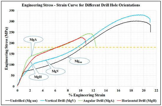 Experimentally observed effects of drill hole orientation on the compressive response of magnesium are presented in Figure 9. The primary mechanical properties obtained from the stress–strain curves for different drill hole orientations, such as compressive yield strength (CYS) (based on 0.2% offset), ultimate compressive strength (UCS) (the highest stress taken) and failure strain, which are compared to monolithic magnesium, as shown in Table 2.