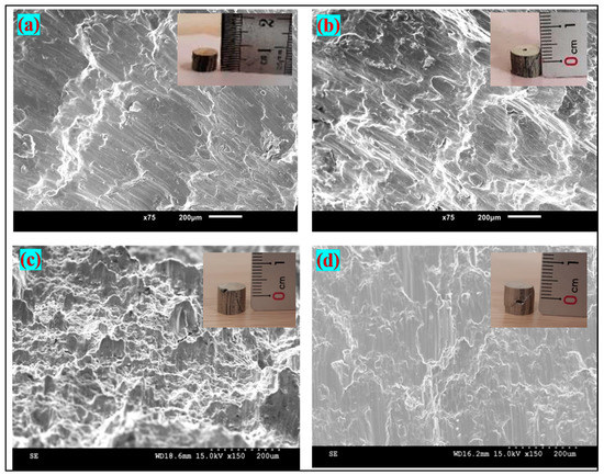 To evaluate whether a change in the mode of fracture was observed, fractographic analyses were conducted on the failure surface of each drill orientation (Figure 10). Fractography analysis using SEM micrographs revealed a shear mode of fracture in all three drill hole orientations as shown in Figure 10 indicating no change in microscopic failure mode. However, on a macroscopic scale, the monolithic and vertical drill hole samples failed at a 45° angle (see insets of Figure 10), while the angular drill hole and horizontal drill hole orientations failed at slightly different angles. The change in shear plane direction can be attributed to the development of shear, as discussed in Section 3.1.1 and shown in Figure 5.