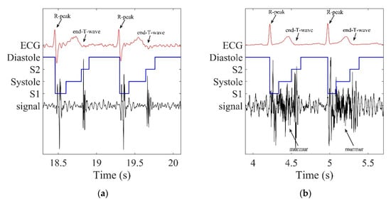 Heart sounds with synchronous electrocardiogram and segmentation results for four states of the heart cycle (S1, systole, S2, and diastole): (a) normal heart sound (b) abnormal heart sound with heart murmur.