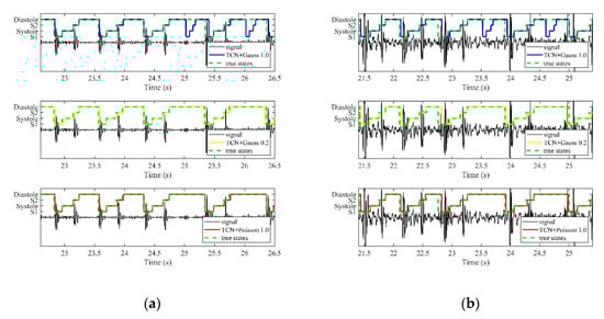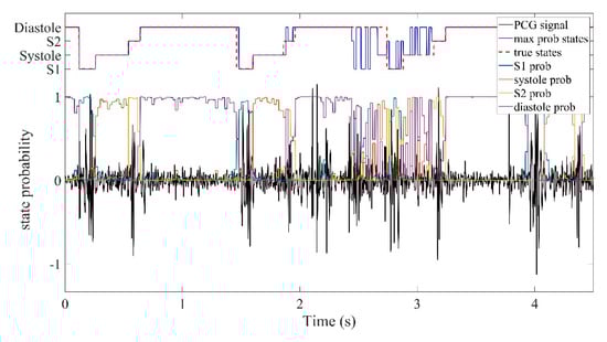 As mentioned in the introduction, many errors in the direct classification annotations violate the fixed state order comprising S1-systole-S2-diastole, as shown in Figure 2. If the algorithm can satisfy the natural requirements for the heart sound states, including the fixed order and lasting for a certain time, order errors will be avoided in the final results and the final detection performance for S1 and S2 can be improved, as shown in Figure 8a.