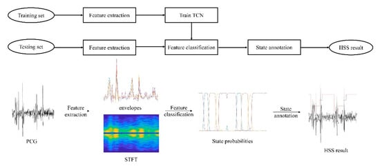 According to the previous studies described above, we proposed a framework based on TCN and HSMM for heart sound state segmentation, as well as conducting experiments with the features of STFT, envelopes, and 1D-CNN, and our enhanced Viterbi algorithm ensured that the final state annotation sequence for heart sounds conformed to the fixed order of S1-systole-S2-diastole.