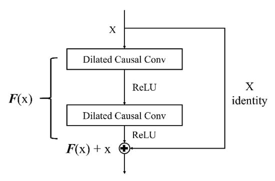 The residual structure allowed the results from each layer to be merged into the final layer, and thus each layer could be effectively learned. The extensive use of residual structures in deep learning also demonstrated the benefit of this structure. TCN employed a generic residual module instead of a convolutional layer to improve the stabilization of the deep network, as shown in Figure 6.