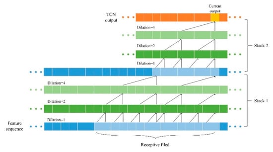In addition, as shown in Figure 7, TCN could increase the depth of the network by increasing the number of stacks, and thus the receptive field expands rapidly. As mentioned above, the scale of the receptive field could be roughly regarded as the product of the number of residual blocks, kernel size, and the last dilation factor d. RNN could also synthesize long-distance information but it could not accurately control the actual time length of the integrated information in the same manner as TCN [20].