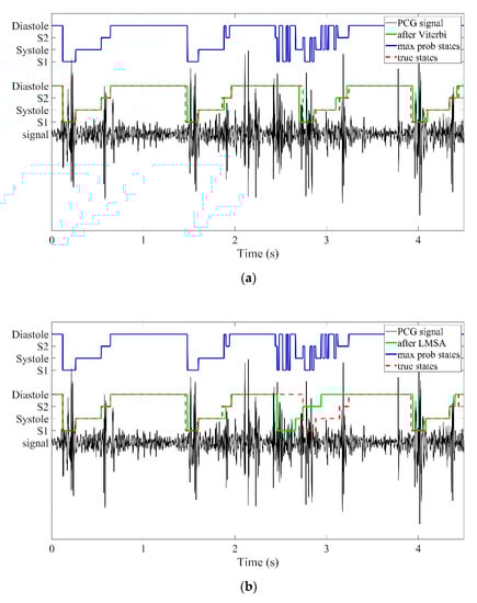 However, due to the effects of various types of noise, many errors will still occur with the 60 ms restriction, as shown in Figure 8b. Even after adding the restriction, LMSA depended only on the state information for the previous several time points rather than the complete information for the signal before the time point, so the performance will be highly dependent on the feature classification results. In other restriction methods, some heart sounds did not match with the actual experience that the systolic period was shorter than the diastolic period, so this experience will not be considered. Maximum time limits should also not be imposed for each state because the duration of diastole often varied greatly and adding a very loose restriction was ineffective.