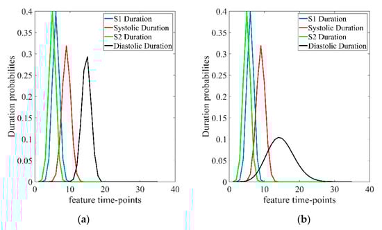Duration probabilities for four states. The S1, systole, and S2 duration probabilities follow the Gaussian distribution. (a) Gaussian distribution for diastolic duration. (b) Poisson distribution for diastolic duration.