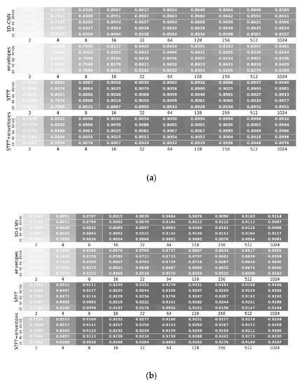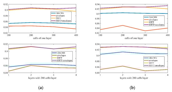 As shown in Figure 11, we tested the features of 80-bin 1D-CNN, 41-bin STFT, 4-bin envelopes, and the 45-bin combination of STFT and envelopes (STFT+envelopes) based on two databases. The cells of one layer shows the results obtained with different numbers of cells in one LSTM layer net and the layers with 200 cells/layer shows the results produced with different numbers of LSTM layers with 200 cells/layer. In order to balance the accuracy and the quantity of the calculations, we decided the parameters for the LSTM network as two layers with 200 cells/layer. In addition, we found that STFT and STFT+envelopes yielded almost the same performance, thereby indicating that envelopes had little effect on increasing the information to STFT. In addition, the hardware implementation scheme for the discrete Fourier transform was sufficiently mature [30], so we employed STFT for comparison in the subsequent experiments, which also enhanced the possibility of a hardware implementation of our algorithm. Moreover, the accuracy of one layer of 1D-CNN was intermediate between that of STFT and envelopes according to the experiments, and the performance of 1D-CNN was significantly weaker than that of STFT.
