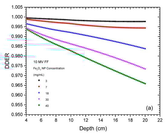 The DDER vs. depth for different Au NP concentrations using the 10 MV FF and 10 MV FFF photon beams are plotted in Figure 1a,b, while similar results for different Fe2O3 NP concentrations are plotted in Figure 2a,b, respectively. To avoid the unstable dose buildup region of the 10 MV photon beams, DDERs are only plotted in the depth range from 4 to 20 cm [17].