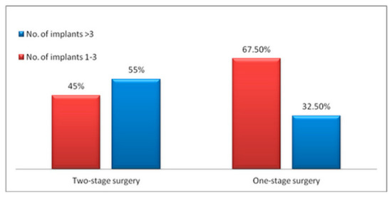 Figure 1 describes the selection of the surgical method depending on the number of implants that were used. The surgeon chose almost equally the two-stage and the one-stage surgical approaches when the number of implants per patient was ≤3 (54.5% vs. 45.5%, respectively, p > 0.05) and preferred the two-stage surgical approach when the number of implants was >3 (75.5% vs. 24.5%, respectively, p < 0.05). The choice of surgical approach according to jaw site is depicted in Figure 2.