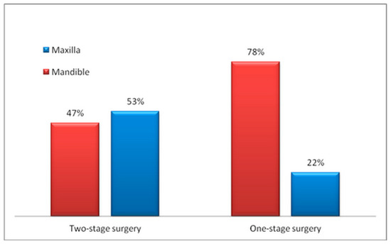 The one-stage surgical approach was chosen almost equally to the two-stage for the mandible (51.9% vs. 48.2%, respectively, p > 0.05), but the two-stage surgery was chosen almost four times more frequently in the maxilla than the one-stage (81.8% vs. 18.2%, p < 0.05).