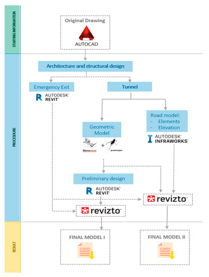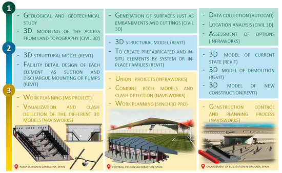 The main purpose of this study implied the use of a significant diversity of software and equipment. For each of the case studies, the methods and technology required were different. In order to develop each project, the methodology had to be carefully studied, in addition to organize the participation of the different academics with expertise in each topic as well as the contribution of students. This process was based on an initial technical characterization of the four projects. The participants in this experiment included a group of civil engineers with an average experience of fifteen years of experience. For these four studies, all the computing resources and access to all Autodesk (Autodesk, Inc., San Rafael, CA, USA) and Bentley (Bentley Systems, Incorporated, Exton, PA, USA) commercial software were available. In addition, other software of great interest such as Dynamo, SketchUP, Revizto, Rhinoceros, and Grasshopper, required for the correct execution of the modeling, were also available.