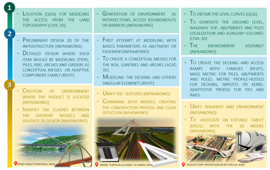 The projects were divided into two main sections: bridges and roads. In the case of bridges, as a first objective, the detailed procedure of the virtual construction of three-dimensional bridge models following BIM methodology was chosen. Further perspectives were defined for each of the case studies.