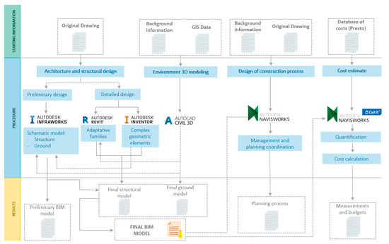 The working sequences shown try to show how by combining different software packages the correct completion of a BrIM model system can be achieved. In the initial phase, the use of tools like Infraworks or Civil3D allows the inclusion of data for the different configuration alternatives and the definition of the basic parameters to be further exported to Revit for the design completion. If both packages are used for the surroundings and access it must be taken into account that importing Civil3D to Infraworks runs perfectly but the inverse process is quite problematic. For a second phase, Infraworks infrastructure modeling can also be used although the most elaborate elements such as hangers and ribs of the bridge must be previously created as parametric elements using Inventor or Rhino. The problem appears when these structural elements are exported because neither Revit nor Navisworks detect their area or volume and so they are not quantifiable. For this reason, at least until this problem is resolved, modeling software such as Revit needs to be directly used for the detailing design of the infrastructure although this requires the creation or modification of a number of families, because such software type is rather limited for highly complex geometries. This can be resolved utilizing “conceptual masses” by previous modeling in Civil3D, AutoCAD3D, or Inventory (all Autodesk, Inc., San Rafael, CA, USA) making a family able to create a dotted Spline in Revit whose area and volume parameters can be assigned. In a final phase, the most useful software to combine the models is managing software such as Navisworks, though the textures and georeferences sometimes may cause problems. It is also possible to combine them in Infraworks but in that case the Revit model must be created as a 3D object.