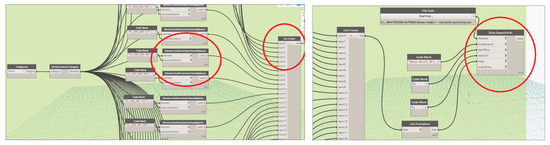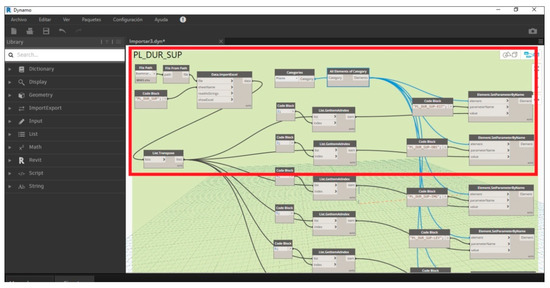 The code generated and executed in Dynamo to obtain a worksheet with the desired parameters was significant given the large number of parameters obtained for each family of elements as well as the large number of inspected elements. Each of the groups created was associated with an element category. The code was generated by means of the commands and functions of Dynamo as can be seen in Figure 10. First, the elements of the desired category are extracted and from that group of elements the desired parameter is obtained using the function Element.GetParameterValueByName. The chains generated with the values of the parameters of all the elements of the category will be linked to a list using the command List Create. This is shown in Figure 10.