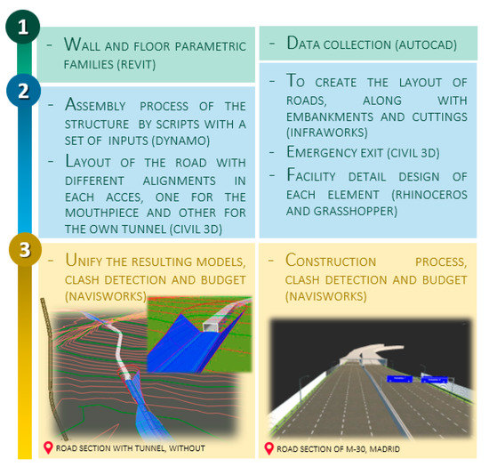 Several stretches of the M-30 Madrid ring highway have been modeled [30] including linear works and some parts of the tunnel (Figure 14). It is one of the world’s highest traffic density roads with 300,000 vehicles per day and a length of 325 km. The goal is to develop a workflow model similar to Figure 6 for the infrastructure maintenance and to link the information of the maintenance workers with the model.