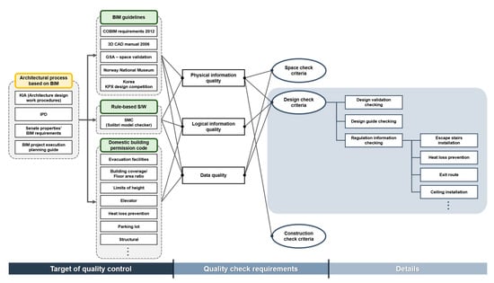 In this section, quality check criteria and checklists are developed through reconfiguration of deduced quality check targets by requirement. As described above, quality check targets based on BIM can be classified into physical information quality, logical information quality, and data quality. For practical applications, they can be separated into space check criteria, design check criteria, and construction check criteria, depending on the applicable goals and methods. The deducted quality check targets and the relevance of criteria developed in this study are shown in Figure 1.