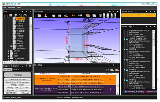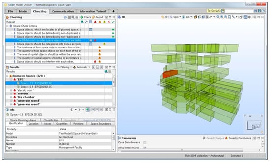 Quality control software that is rule-based is able to perform an accurate and detailed clash check of physical BIMs. Navisworks and the Solibri Model Checker (SMC) are two leading software programs in the construction industry that can check model quality based on BIM. Navisworks has strengths in 4D and can only perform physical checks such as a clash check [30]. The SMC is the most common and widely used tool for BIM quality control in the GSA of the US, senate properties in Finland and bips in Denmark. The SMC was also used during the building design of the Korea Power Exchange headquarters as a tool for quality checks [31]. The SMC can perform various functions such as space, accessibility, structure, constructability, and regulation checks through a rule set that the user defines [10]. The Building and Construction Authority (BCA) of Singapore and the Ministry of Land, Infrastructure and Transport (MOLIT) of Korea are also developing a system that can check BIM-based building permission code [32,33]. BCA targets accessibility among building permission codes, and Korea has SEUMTER that checks building permission codes. In these projects, software that can automatically check each building permission code has been developed and applied.
