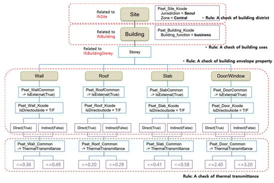 The BIM property information contains the names of materials that have further applicable information for various disciplines. This property information is utilized to determine quality checking results in the rule-based quality checking system. Software can be communicated using a neutral format throughout the open BIM environment, such as IFC, which is an international standard [27,36,45]. Open BIM is a universal approach to the collaborative design, realization, and operation of buildings based on open standards and workflows [27]. IFC provides the definitions for additional property information through the development of a property set (PSET) in the extension of the concept model for the definition of additional attributes of the BIM [16,36]. buildingSMART provides basic PSETs (e.g., Pset_WallCommon) along with a methodology for defining additional properties for building objects. The PSETs and properties for applying the regulations (e.g., heat loss prevention criteria) are shown in Figure 4.