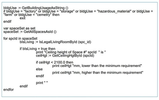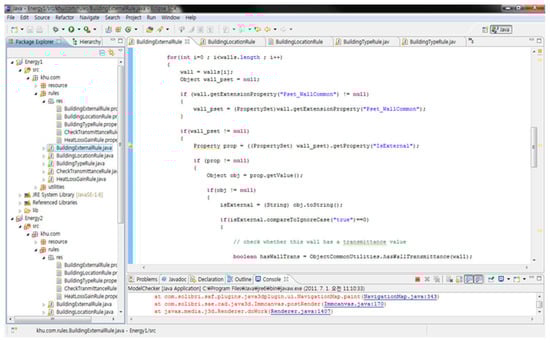 Regulation information should be structuralized in conjunction with IFC for using rules that are related to regulations in the SMC [36,46]. The rules have to be defined as a separate class (Java file) in the SMC Java API environment (See Figure 5), and the required properties and checking order must be defined with IFC structure and regulation contents [36]. This study focuses on heat loss prevention regulation checking criteria and generates the coded Java file from delimited rules (e.g., a check of building district, building uses, building envelope property, and thermal transmittance).