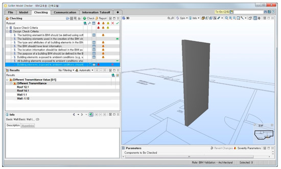 In this section, a quality check of BIM data was performed to validate the applicability of the developed quality check criteria, by using rule-based quality check software. Some of the criteria for space and construction checks were established based on modifications to the basic rules supported by SMC, as previously mentioned. For the design check criteria, heat loss prevention criteria were additionally developed, and these also were adopted in quality checks. Revit and ArchiCAD were used as the BIM software. The properties of regulation information in the design criteria were input with basic modeling according to the LOD of BIM, as suggested in this study. A summary of the application example models is provided in Table 8.